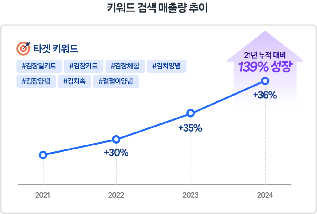 실제로 쿠팡에서도 김장 시즌(10월~12월) 동안 김장 밀키트, 김치 양념, 김치속 등의 검색량이 꾸준히 증가하고 있으며, 관련 검색 매출량 추이 역시 매년 상승세를 보입니다.