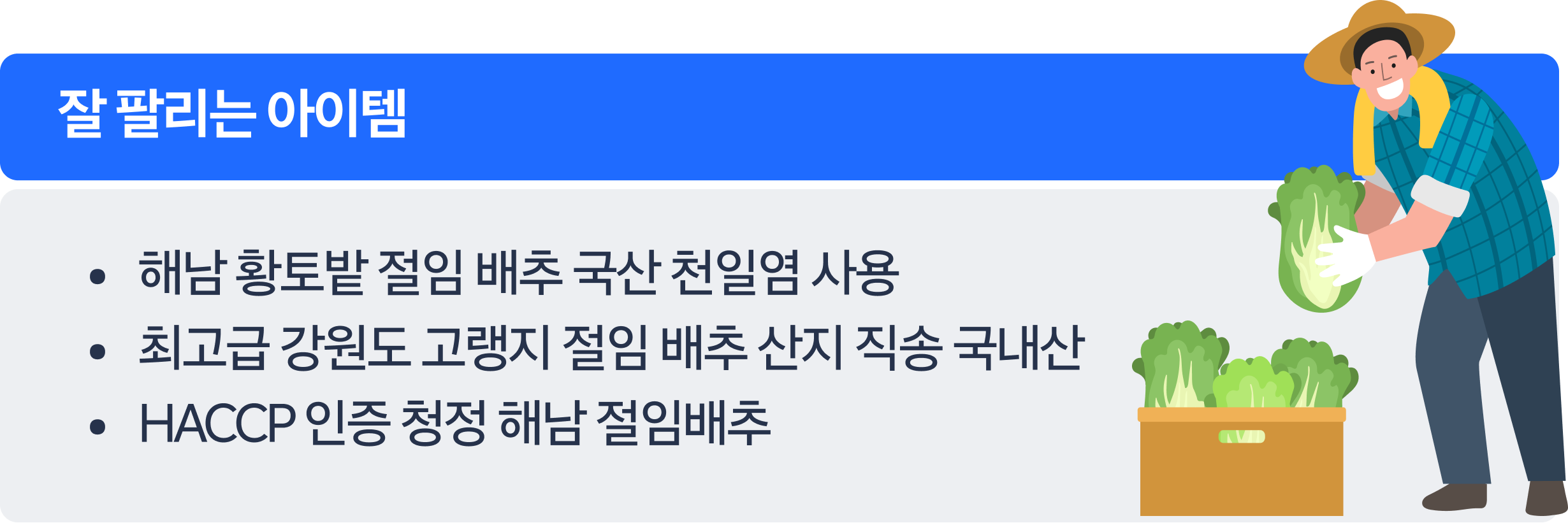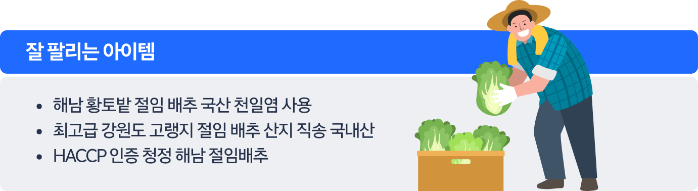 – 배추 원재료를 살피는 고객들을 고려해 국내산, HACCP 인증 포인트 어필 추천
