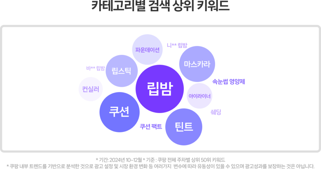 작년 10월부터 12월까지, 쿠팡에서 가장 많이 검색된 메이크업 키워드를 살펴봤을 때 1위는 립밤, 2위는 쿠션, 3위와 4위는 각각 틴트와 마스카라가 차지하며 4분기 인기 아이템으로 등극했습니다.