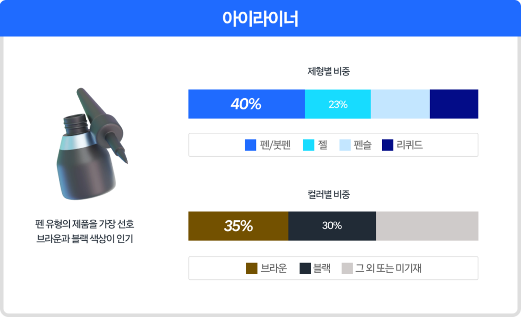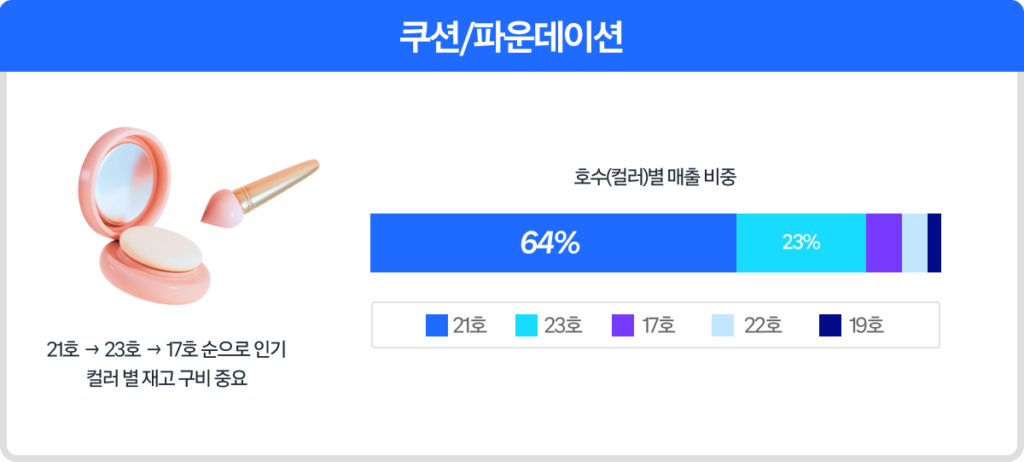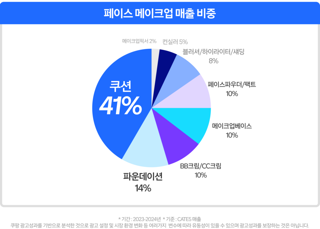 페이스 메이크업도 매출 비중을 살펴봤을 때, 쿠션이 전체 매출의 41%를 차지하는 핵심 제품으로 확인됐죠. 그 뒤를 파운데이션, BB/CC크림 제품이 이어가며 꾸준한 수요를 보였습니다.