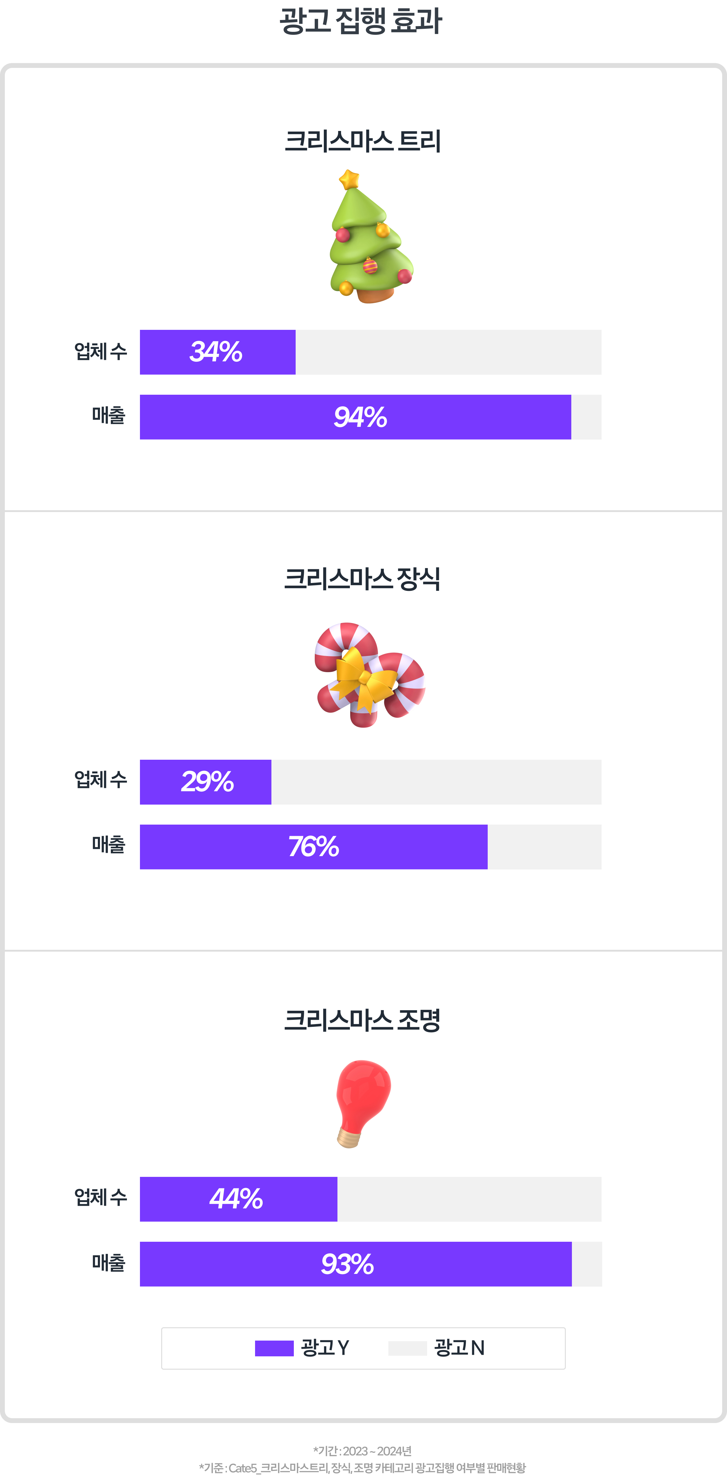 인테리어 세부 카테고리별로 광고 유무에 따른 제품 매출 인사이트를 살펴봤습니다. 크리스마스 소품의 경우, 광고를 집행하는 업체가 전체 매출의 70~90% 가까이 차지하고 있었습니다.
