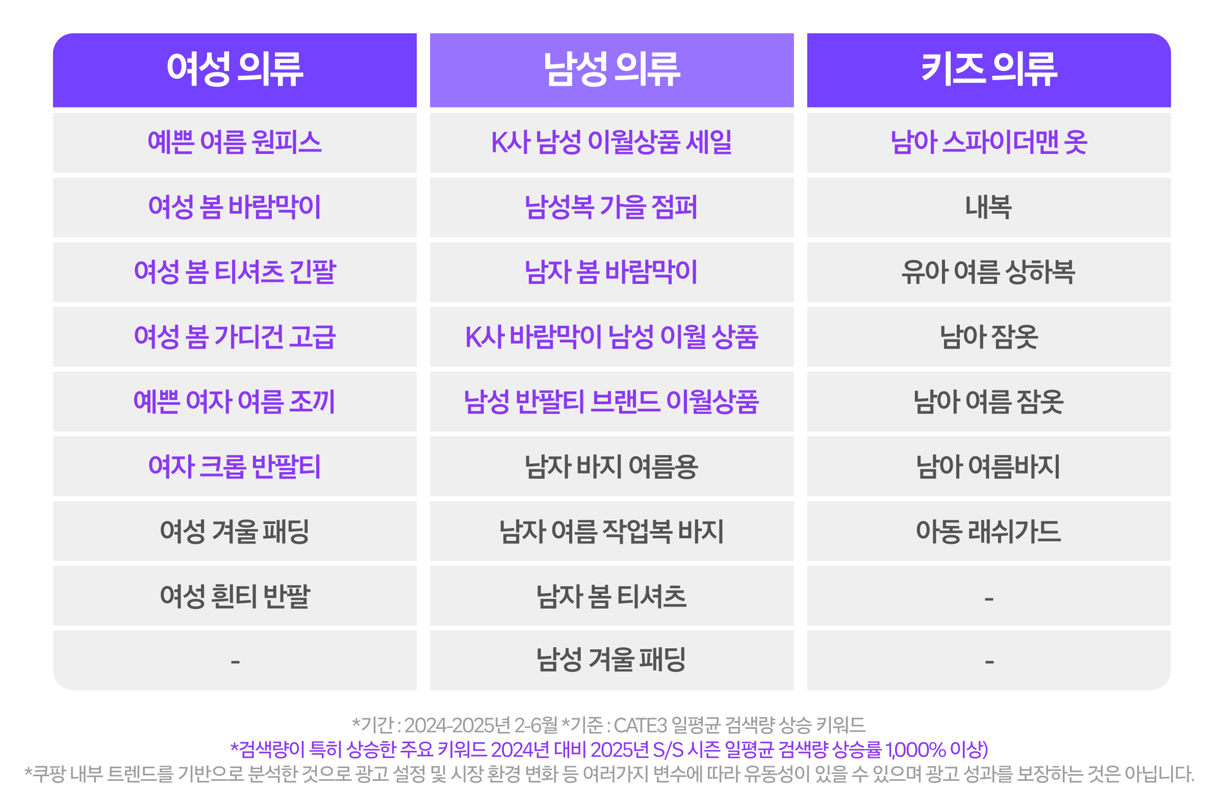 전반적으로 봄 바람막이, 여름 원피스처럼 계절 키워드를 활용한 검색어가 두드러졌습니다. 특히 남성 의류의 경우, 특정 브랜드명에 이월 상품과 같은 키워드를 결합한 검색이 다수 나타나며 높은 관심을 보였습니다.