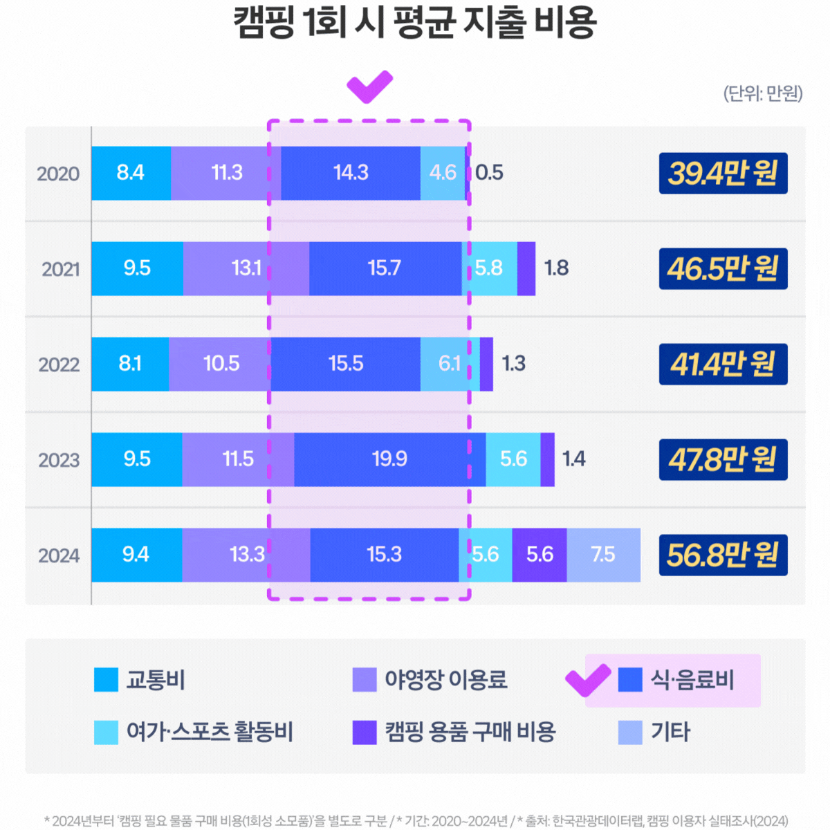 캠핑을 즐기는 사람들의 2020년부터 2024년까지 5년간의 소비 형태를 살펴봤을 때, 캠핑 1회 시 지출 비용은 약 39만 원에서 57만 원으로 증가하며 전반적인 소비가 확대된 것으로 나타납니다.