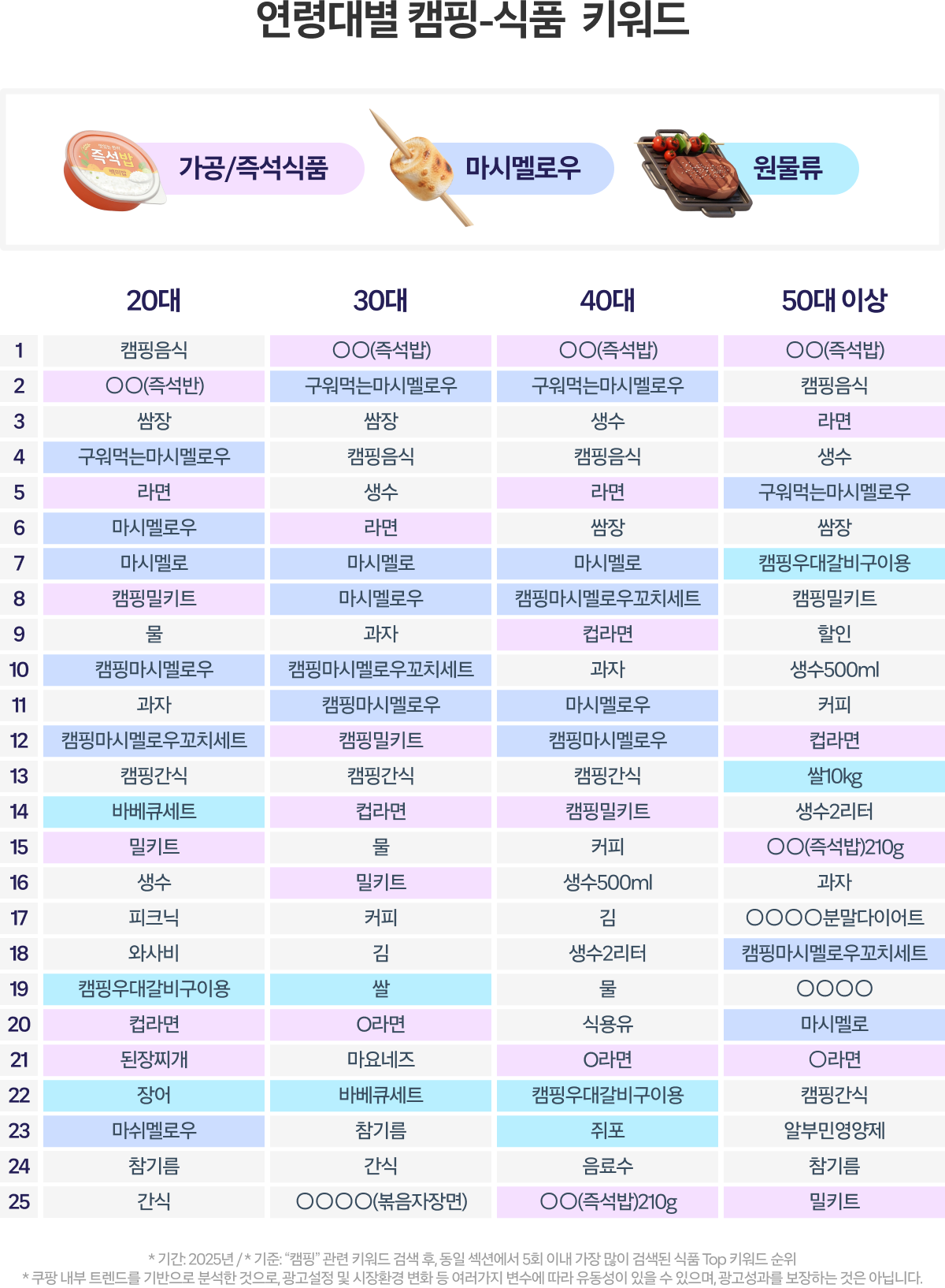 특히 많은 고객이 캠핑 음식 키워드를 직접 검색하며 구매 전 탐색 과정을 거치고 있는데요. 이러한 인기 키워드를 비즈니스 전략에 적극 활용해 보시길 추천드립니다.