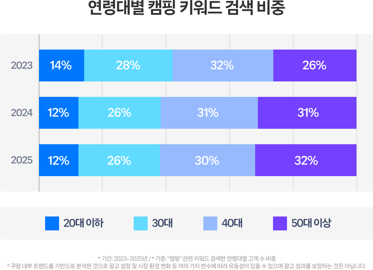 캠핑 키워드를 검색한 고객을 연령대별로 분석한 결과, 40대와 50대 이상 연령층에서 가장 높은 비중을 차지했으며 특히 50대의 비중은 점차 증가하는 추세를 보이고 있습니다.