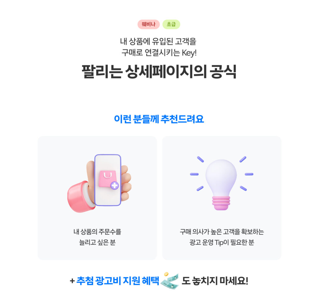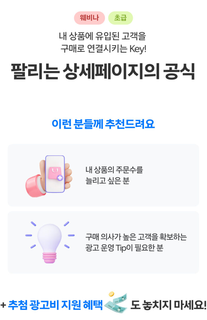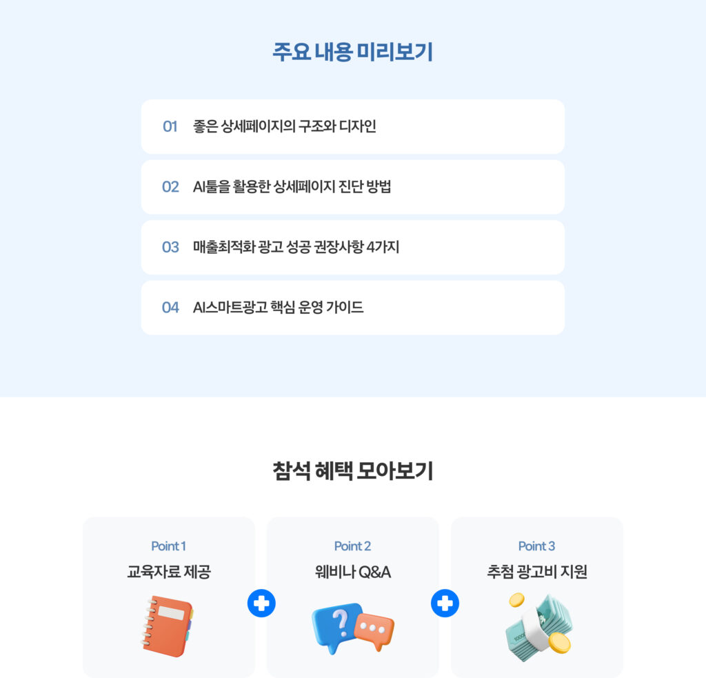 • 광고비 지원 혜택은 매월 추첨 이벤트를 통해 제공해 드리며, 교육 참석 후 출석체크 설문을 제출해 주시면 자동 참여됩니다.