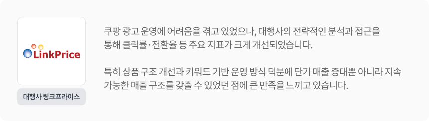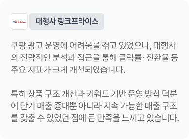 ⓘ 실제 쿠팡 광고를 진행한 광고주의 성공사례로, 광고 캠페인 설정 및 상품, 시장상황 등에 따라 광고효과에는 차이가 있을 수 있습니다.