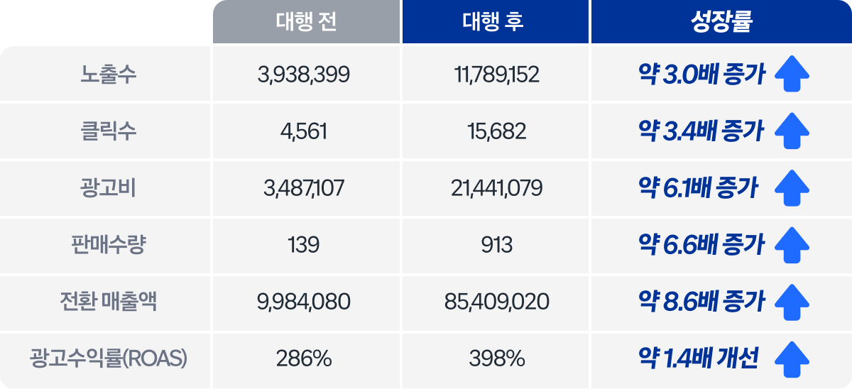 전환 매출액이 8배 이상 증가, ROAS 또한 안정적으로 개선되어 단기 성과를 넘어 지속 가능한 매출 성장 구조를 확보했습니다.